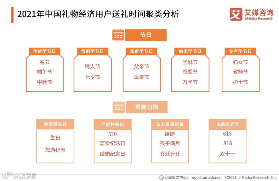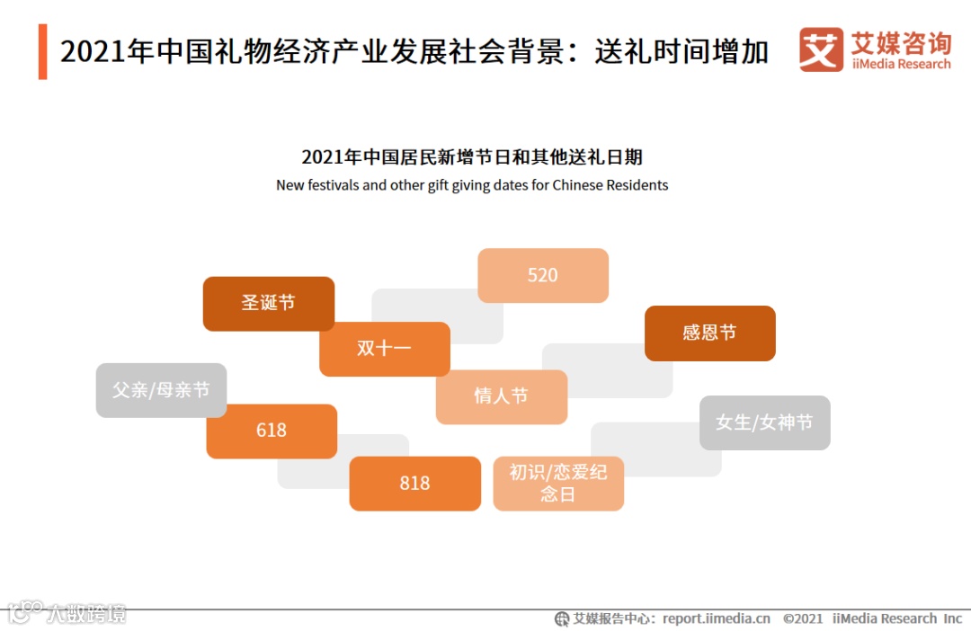 近年来,中国国内出现越来越多的新节日,如西方的圣诞节、情人节等,以及618、双十一等电商自造节日,尤其是情侣之间互赠礼物的各种节庆如520和各种纪念日等增加明显。艾媒咨询分析师认为,送礼时间的增加背后反应的是人们对于礼物和赠送礼物的需求在不断增长。