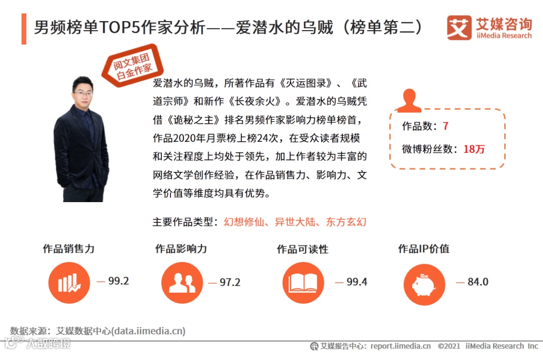 艾媒咨询分析师认为,爱潜水的乌贼主要创作作品题材为玄幻类,与男频网络文学读者偏好类型契合,作品热度和口碑较高。加上爱潜水的乌贼此前具有多部较高人气的作品,积累有广泛的粉丝群体,对于发展作品IP衍生产品的前景十分广阔,其商业价值也将得到进一步提升。