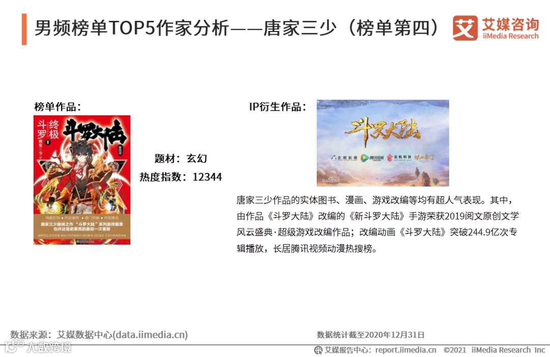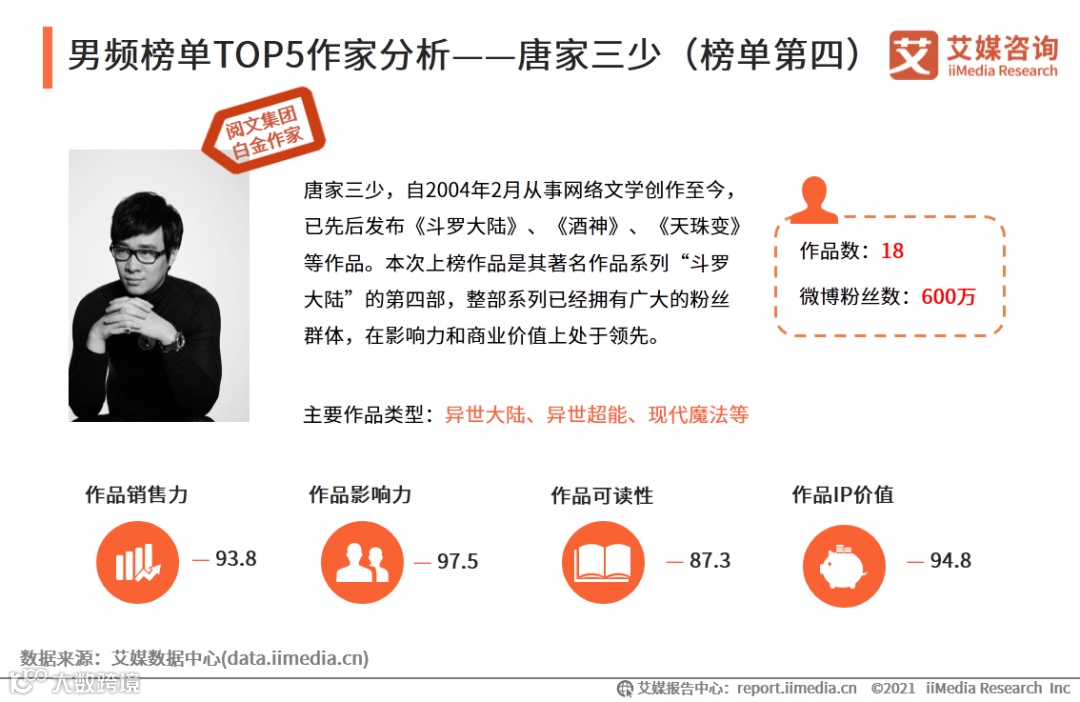 唐家三少,自2004年2月从事网络文学创作至今,已先后发布《斗罗大陆》、《酒神》、《天珠变》等作品。本次上榜作品是其著名作品系列“斗罗大陆”的第四部,整部系列已经拥有广大的粉丝群体,在影响力和商业价值上处于领先。