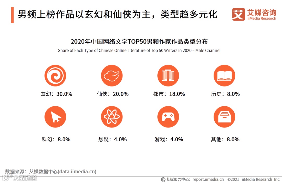 iiMedia Research(艾媒咨询)数据显示,2020年中国网络文学男频作家影响力榜单50强中,玄幻和仙侠分别以30.0%及20.0%的占比位列作品类型分布前两位,后续是都市、历史、科幻、悬疑、游戏等类型。艾媒咨询分析师认为,受读者年龄和特点影响,男频网络文学作品长期以来均以玄幻仙侠类作品最受欢迎,也成为此次榜单主要作品类型。但随着使用网络文学平台人群变迁,以及相关影视及文娱作品影响,热门题材每隔一段时期都会发生变化,2020年都市幻想题材也成为榜单上重要作品类型。
