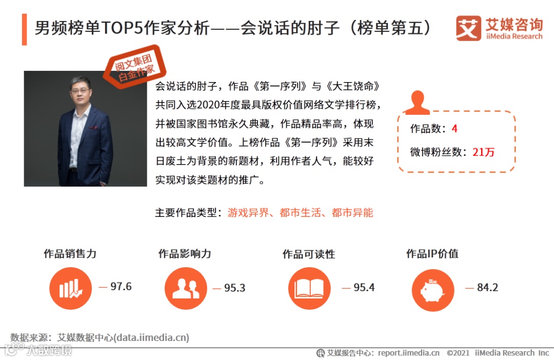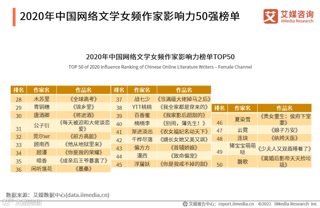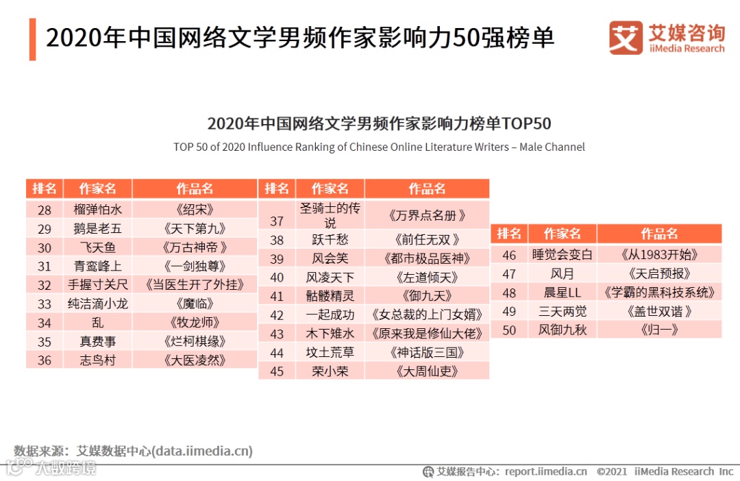 以上内容源自艾媒咨询发布《2020年中国网络文学作家影响力榜单解读报告》,完整版共42页;限于公众号篇幅,故仅摘部分数据和观点,如有兴趣深入,移步报告中心官网下载:戳我下载