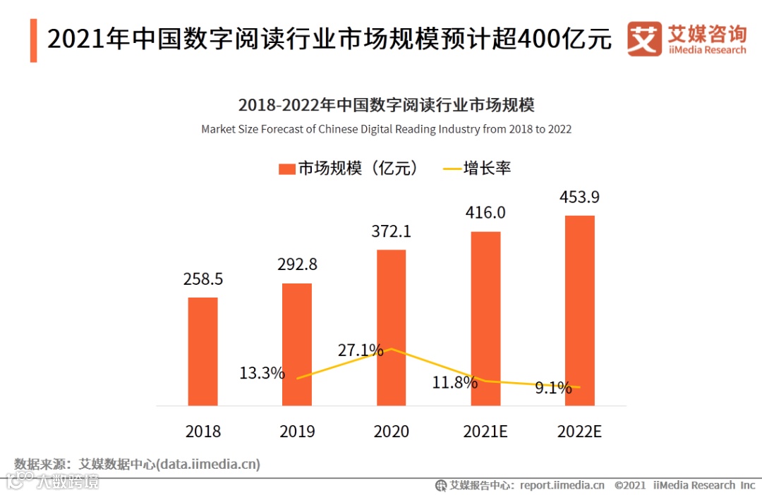 iiMedia Research(艾媒咨询)数据显示,2020年中国数字阅读行业市场规模达372.1亿元,预计2021年中国数字阅读市场将达416.0亿元。艾媒咨询分析师认为,数字阅读行业生态越趋完善,行业发展逐步深化的大背景下,网络文学行业逐步发展和拓展,作家及热度作品IP价值愈发明显。