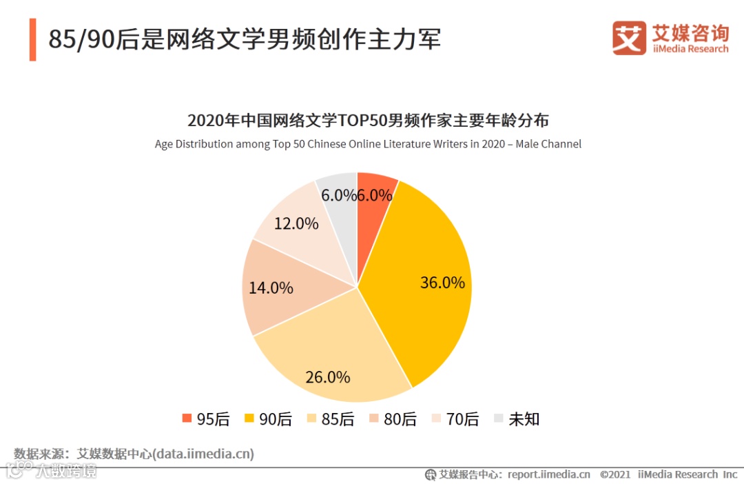 iiMedia Research(艾媒咨询)数据显示, 超过六成上榜2020年中国网络文学男频作家影响力榜单的作家为85后及90后,占比分别为26.0%及36.0%。艾媒咨询分析师认为,中国网络文学起步早,其中70后和80后群体较先接触网络文学,经历了较长时间的沉淀。但网络文学作者群体也呈现出年轻化趋势,85/90后作家群体占比越来越高,为网络文学带来更多元的创作风格和题材类型。