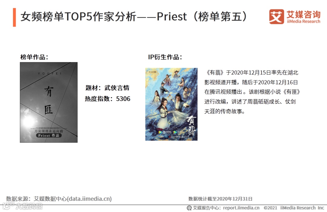Priest的作品类型涵盖更广泛,不仅涉足古现代言情,更是尝试了女频作家颇少涉足的玄幻都市题材。艾媒咨询分析师认为,Priest凭借其作品广泛的涉猎度获得了众多的粉丝,加上《有匪》改编影视作品后带来海量新粉丝,未来其新作品在推广上将具有更大优势。