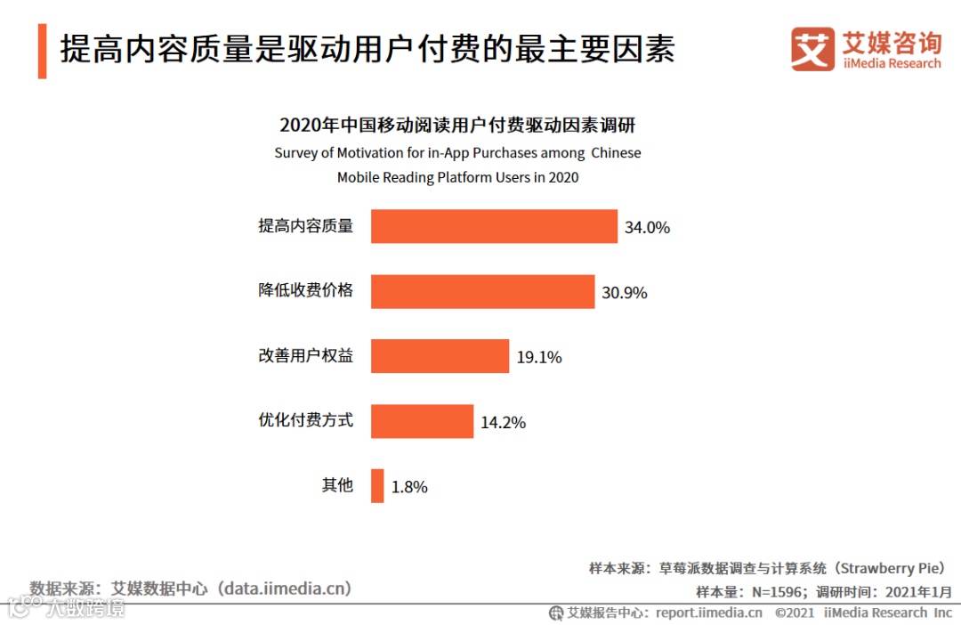 iiMedia Research(艾媒咨询)数据显示,34.0%的移动阅读用户消费主要驱动因素是内容质量,30.9%愿意在平台收费下降后消费。艾媒咨询分析师认为, 移动阅读用户主要看中内容质量和收费价格,其次是用户权益的保障,移动阅读平台应该把好质检大关,并提供更合理的价格或者收费方式,并保障用户消费的权益才能驱动更多的优质用户消费。