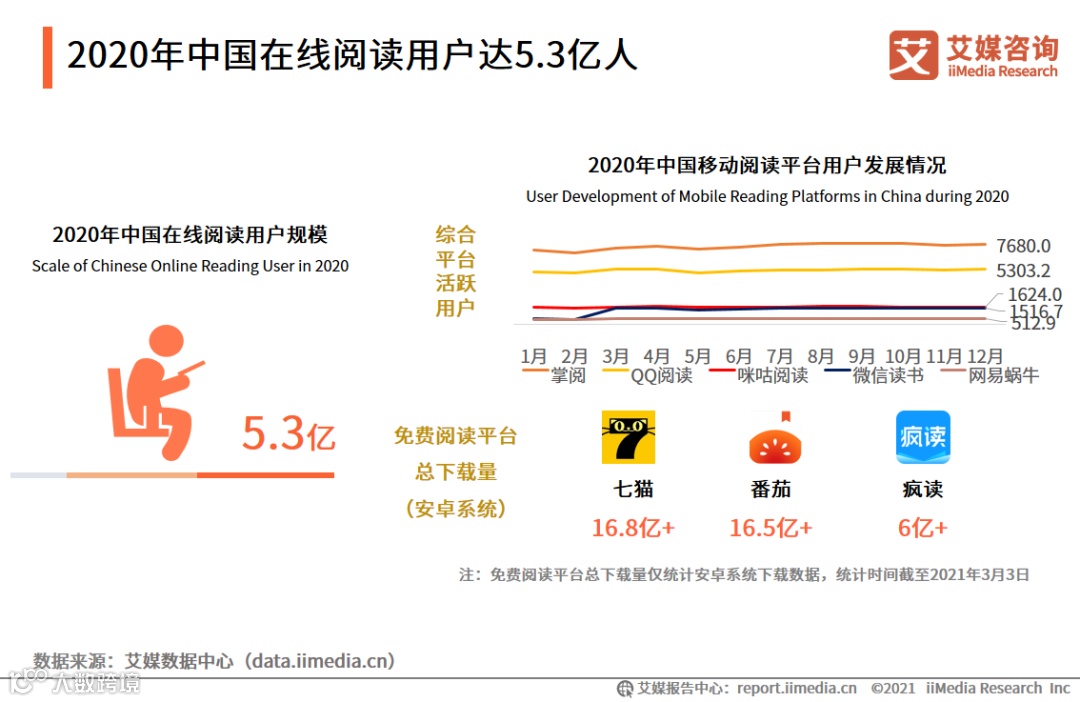 iiMedia Research(艾媒咨询)数据显示,2020年各主要平台月活数稳定;另外,2020年中国整体在线阅读规模达到5.3亿人。艾媒咨询分析师认为,移动平台建设、精神需求增长、阅读场景深挖及监管机构严厉强调版权保护进而促进原创作品生产是用户不断增长的主要原因。