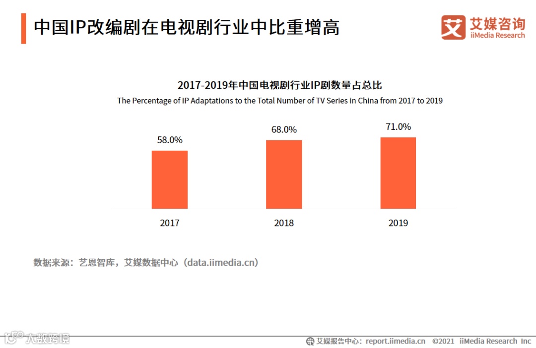 iiMedia Research(艾媒咨询)数据显示,2017-2019年IP剧占电视剧数量之比逐年上升,IP价值受到市场认可。艾媒咨询分析师认为,未来IP将继续以影视剧改编为主,同时在漫改、有声化、短视频方向探索改编模式。