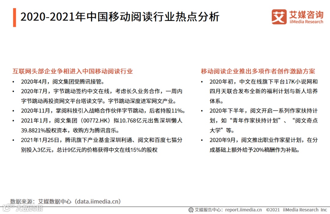 以上内容源自艾媒咨询发布《2020年中国移动阅读行业发展专题研究报告》,完整版共52页;限于公众号篇幅,故仅摘部分数据和观点,如有兴趣深入,移步报告中心官网下载。戳我下载