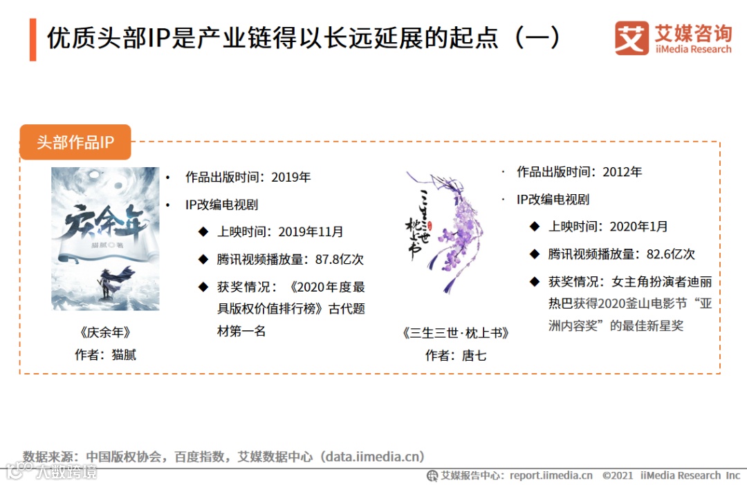 艾媒咨询分析师认为,《庆余年》和《三生三世·枕上书》为2020年度受到讨论度最高的两部头部IP改编影视作品,受益作品质量,改编后作品获得广泛好评,反向带动原著作品阅读量。同时,两位作家的多部其他作品都受到市场关注或被提上改编日程,资本迅速围绕优质头部IP展开布局。