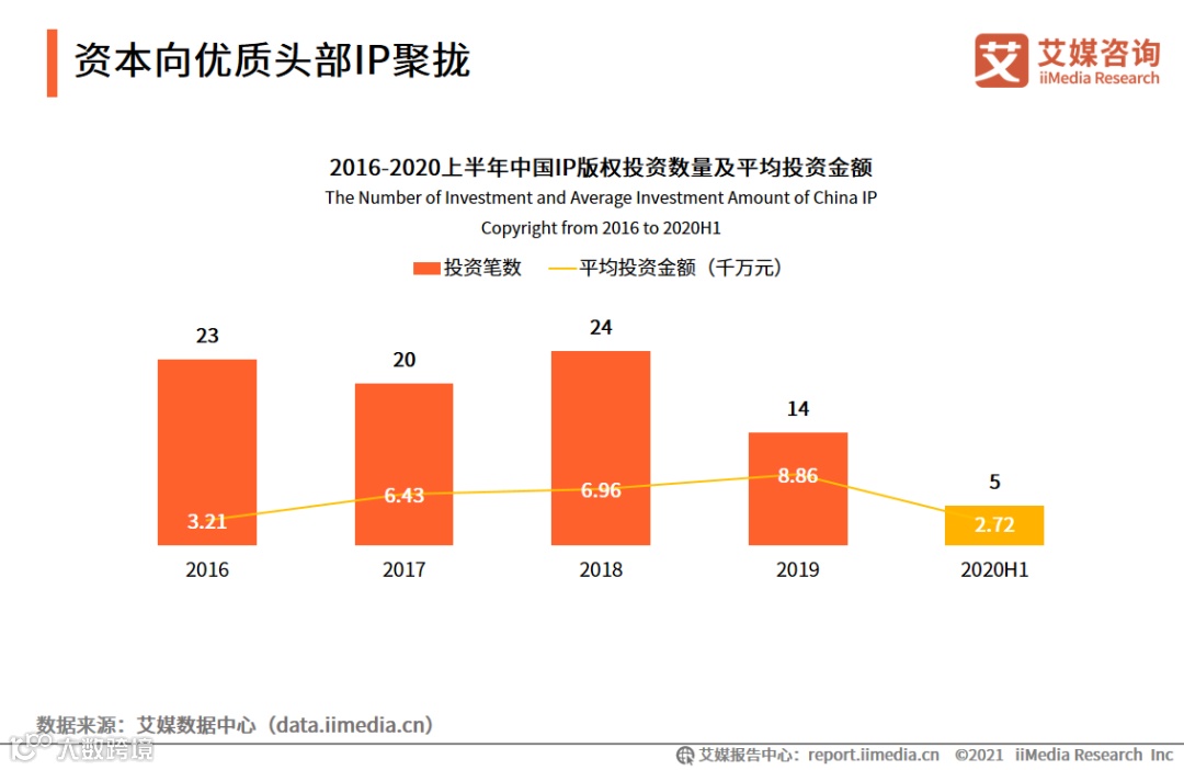 图表10:2016-2020上半年中国IP版权投资数量及平均投资金额