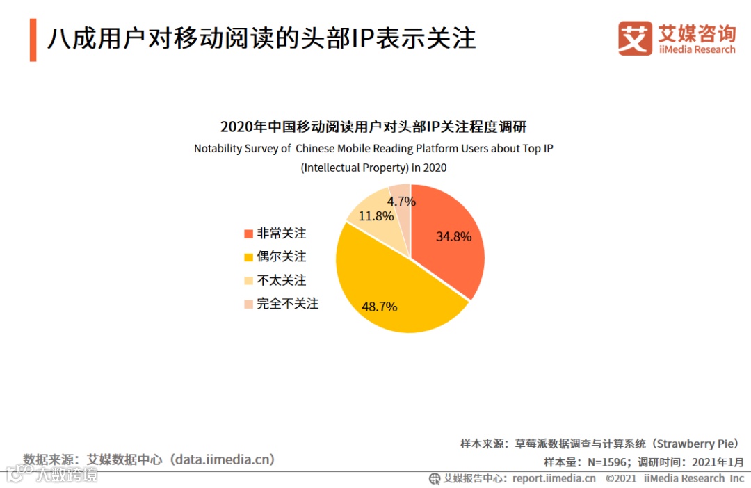 iiMedia Research(艾媒咨询)数据显示,34.8%的移动阅读用户对于头部IP非常关注,而48.7%表示偶尔关注。艾媒咨询分析师认为,网络文学作品数量众多,大部分移动阅读用户在选择作品阅读时会把头部IP作为首选。