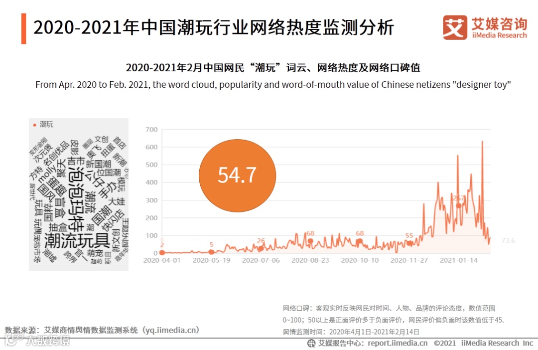 艾媒商情舆情数据监测系统数据显示,2020年4月至今, “潮玩”的热度指数出现一波向上增长的趋势,其中2020年12月泡泡玛特上市及二次销售的丑闻引发网络关注。2021年2月6日—7日、2月12日-28日济南方特新春潮玩年夜场连开,也吸引了不少网民的关注,从而使得潮玩的网络热度达到顶峰。