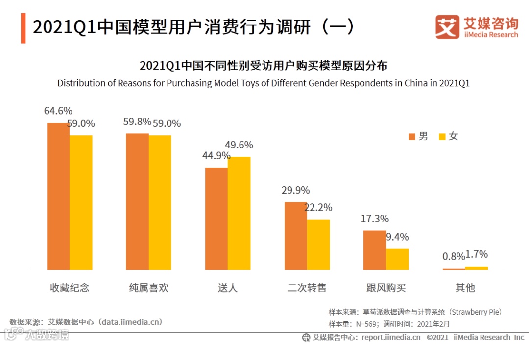数据显示,超过六成的男性用户为了收藏而购买模型,近6成女性受访用户购买原因是收藏和纯属喜欢。此外女性用户买模型送人的场景高于男性,占比近5成,但男性购买模型进行二手交易的原因占比又明显高于女性用户。艾媒咨询分析师认为,模型的收藏价值正在日益凸显,不少用户在收藏过程中收获情感上的满足,同时认可模型是一种保值增值的资产,并在二手市场交易从而获得产品溢价收入。
