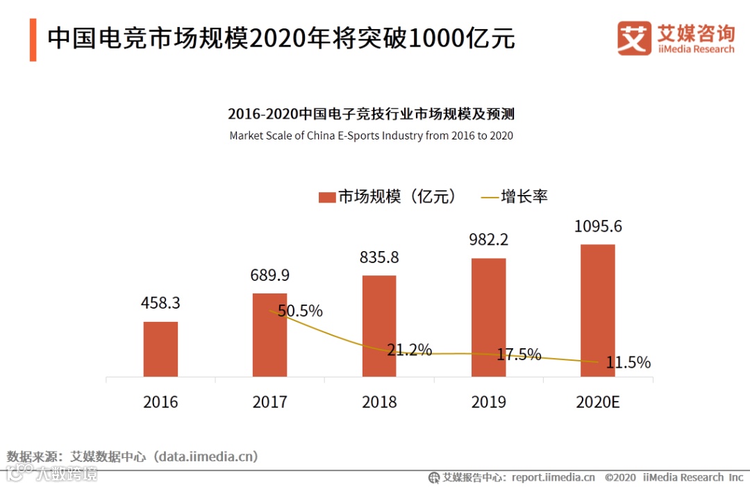 中国电竞行业将迈入千亿市场,移动电竞成主要推动力。2019年中国电竞市场规模达到982.2亿元,预计2020年增至1095.6亿元,市场稳步扩大。其中,移动电竞成为行业增长主要推动力,2020年中国移动电竞用户规模有望达到3.75亿人。
