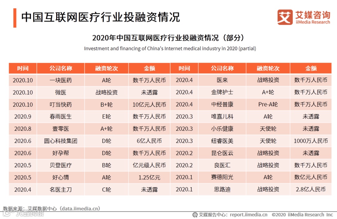 图表4:2020年中国互联网医疗行业投融资情况(部分)