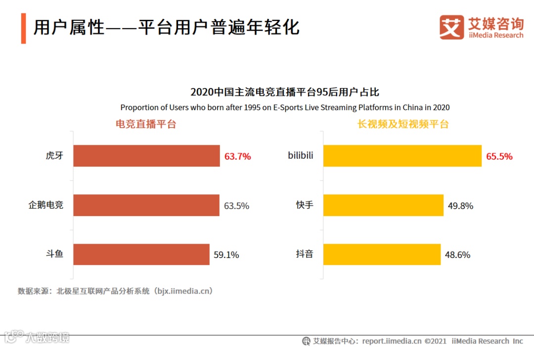 iiMedia Research(艾媒咨询)数据显示,电竞直播主流平台用户普遍呈现年轻化特点,其中虎牙直播及bilibili分别在电竞直播平台及视频平台中95后用户占比最高,达到63.7%及65.5%。