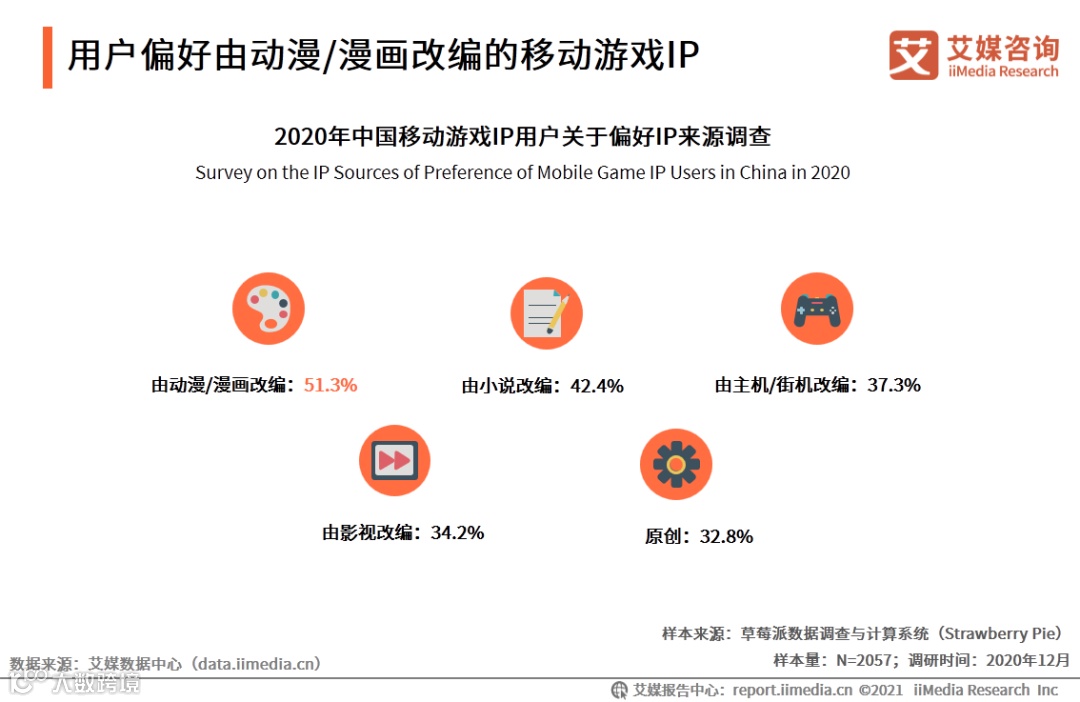从用户偏好的移动游戏IP来看,51.3%的受访移动游戏IP用户一般会选择由动漫、漫画改编而成的移动游戏。艾媒咨询分析师认为,除原创IP以外,其他题材类型的IP均具有原生的潜在用户群体;并且用户对其人物设定、故事情节等有一定的了解,对由IP改编的移动游戏所表达的游戏文化具有更高的接受度。