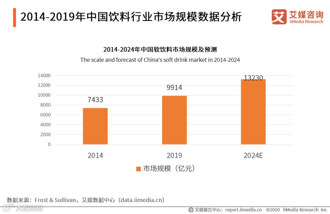 饮料方面,主要以软饮料、固体饮料和新式茶饮为主。艾媒咨询数据显示,2014-2019年中国软饮料市场规模持续上升,2019年中国整体软饮料市场销售收入达到9914亿元,五年间年均复合增长率5.9%。按2014-2019年的复合增长率计算,2020年中国软饮料市场规模将突破万亿,2024年有望达到13230亿元。
