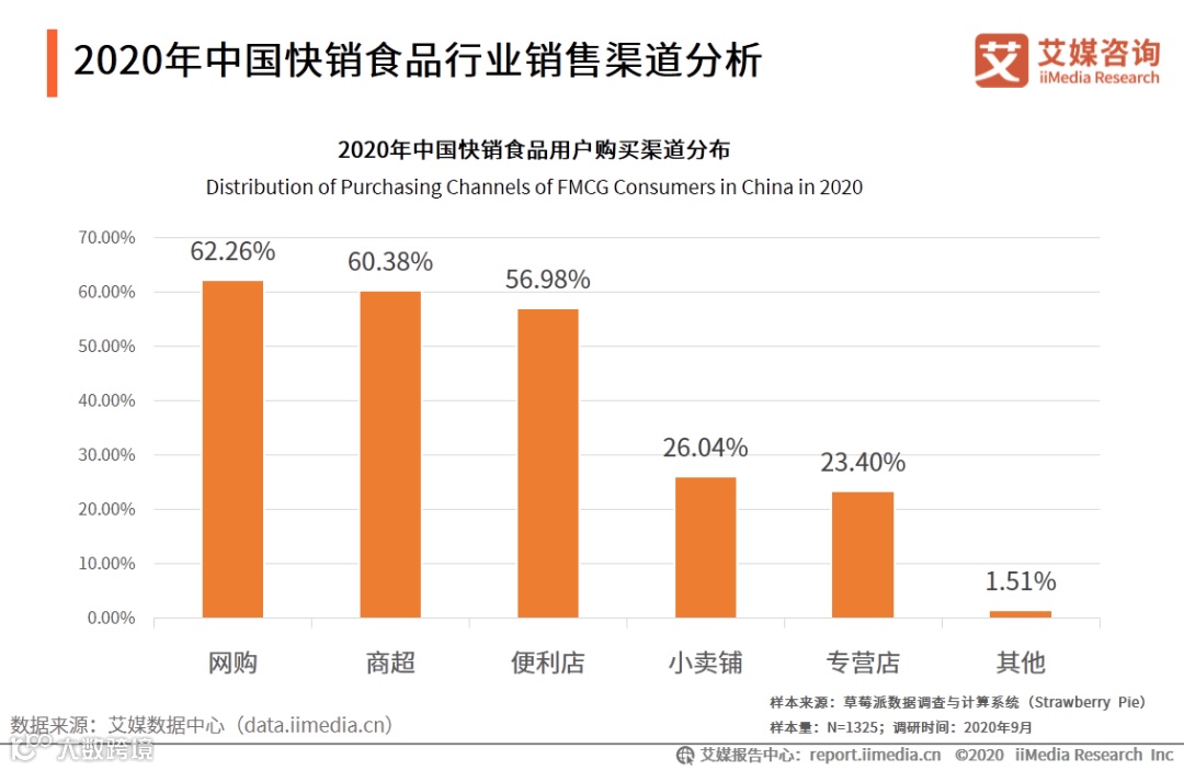 从用户购买渠道来看,中国快销食品的销售渠道主要有网上销售、商城和个体零售商等。艾媒咨询分析师认为,随着多年互联网基础设施的夯实和网购市场教育,加上2020年新冠疫情的刺激,线上消费已经成为大部分消费者的选择,预计,未来快销食品的网上销售渠道占比会持续扩大,逐渐替代线下渠道发展成为销售渠道的主流。