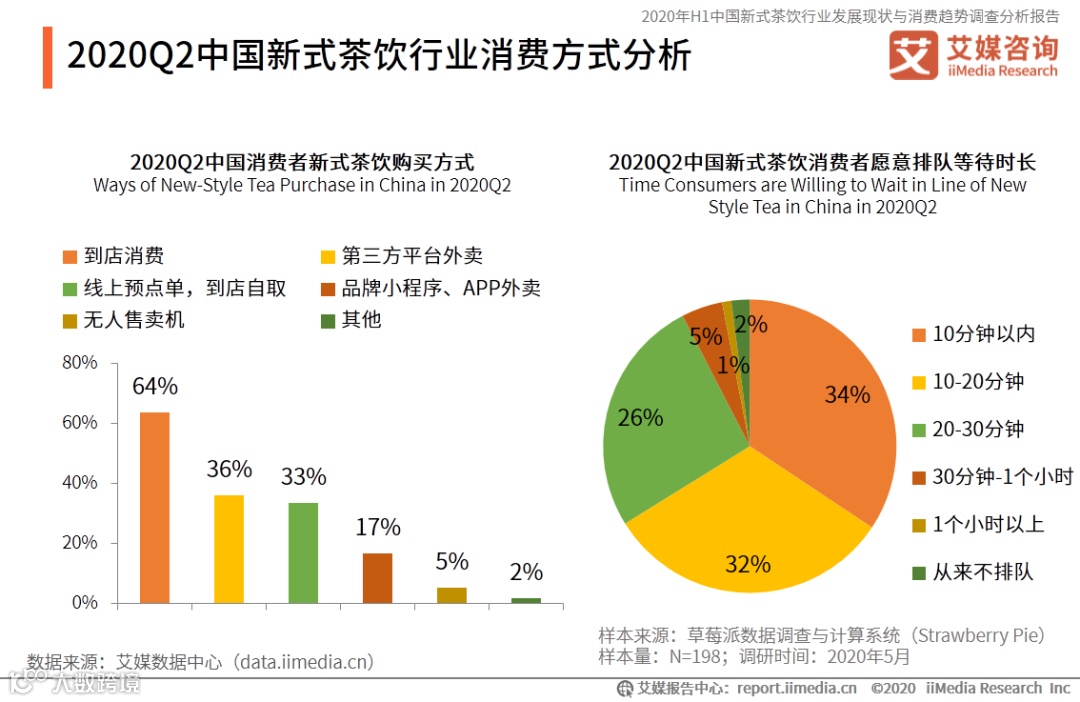 从消费方式来看,iiMedia Research(艾媒咨询)数据显示,2020年Q2中国消费者购买新式茶饮的主要方式是到店消费,占比64%,其次是第三方平台外卖和线上预点单,分别占比36%和33%;另外,大部分消费者愿意排队等待的时长在30分钟以内,共占比92%。