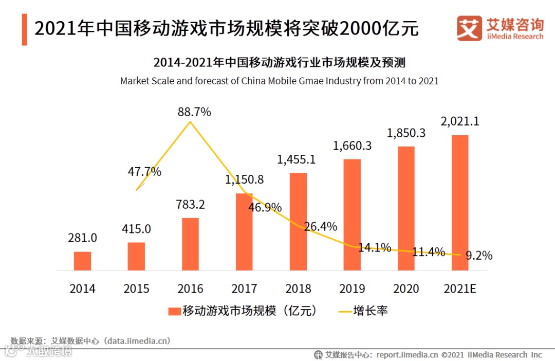 iiMedia Research(艾媒咨询)数据显示,中国移动游戏市场规模逐年增长,但增速有所放缓,2020年达1850.3亿元,2021年预计达到2021.1亿元。