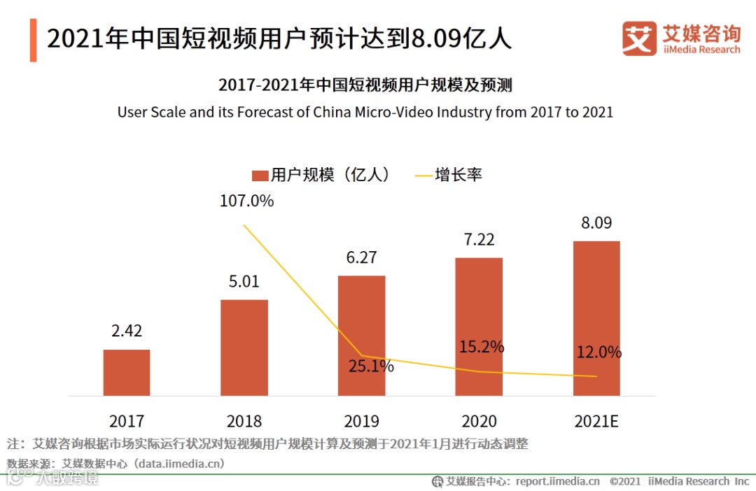 iiMedia Research(艾媒咨询)数据显示,中国短视频用户规模增长势头明显,2020年已超7亿人,预计2021年增至8.09亿人。