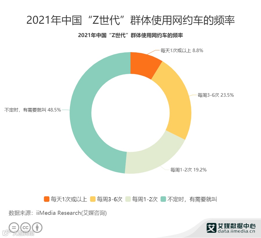 其中,Z世代对以网约车为代表的新型共享出行方式接受度高于非Z世代。艾媒报告中心(data.iimedia.cn)数据显示,23.5% Z世代用户为网约车高频用户,每周使用网约车的频率为3-6次。与此同时,19.2% Z世代用户每周使用网约车的频率为1-2次,而48.5% Z世代用户不定时使用网约车,有需要就叫。