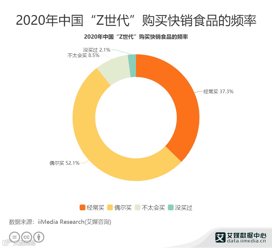 艾媒报告中心数据显示,37.3% Z世代用户经常购买快销食品,同时有52.1%的用户偶尔买快销食品,从没买过的Z世代群体占比仅为2.1%。从品类来看,Z世代最常购买的是烘焙零售,其次为方便食品。