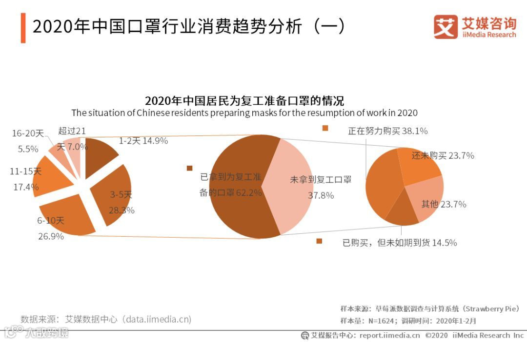 iiMedia Research(艾媒咨询)数据显示,受访用户中,已拿到为复工准备的口罩的人数占比为62.2%,在未拿到为复工准备的口罩的受访者中,有38.1%的人正在努力购买。艾媒咨询分析师认为,目前有超过六成的居民已拿到为复工准备的口罩,在政府相关宣传引导下,短期内民众购买口罩的热情有所缓和,而未能拿到复工用的口罩的居民超过半数有购买意愿,且口罩具有库存期限,在疫情得到控制之前,口罩行业的消费量将持续稳定地增长。