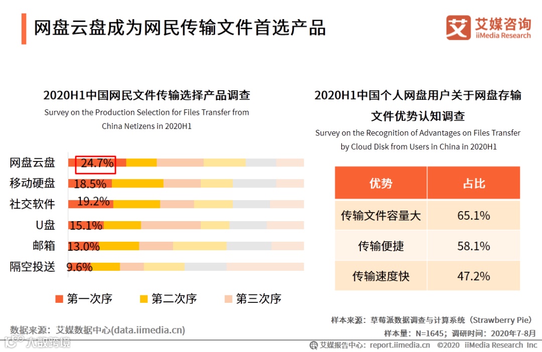 iiMedia Research(艾媒咨询)数据显示,对于文件的传输分享,网盘云盘成为受访网民最主要选择,综合排序及首选网民占比均排名第一。其能够实现对更大容量的文件实现传输的特点成为最受用户认可的优势,占比65.1%。艾媒咨询分析师认为,不同于其他文件存储及传输渠道,网盘具有的存储空间更大,能实现对大体量文件的保存,因此能够更好满足使用者对不同类型文件资料的传输和分享。