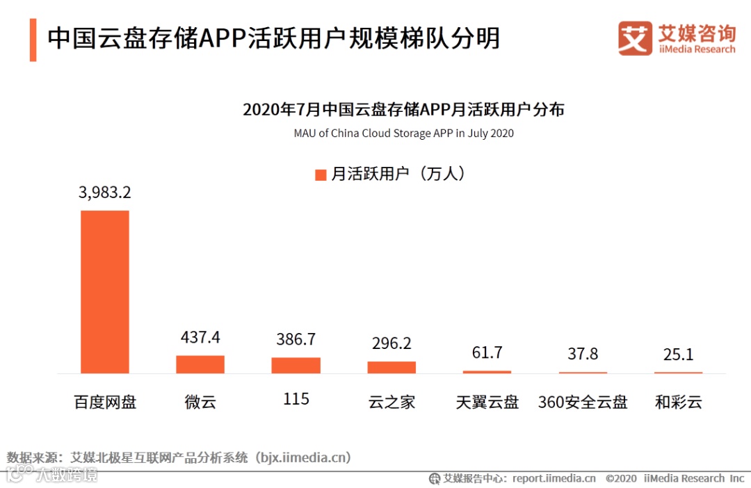 iiMedia Research(艾媒咨询)数据显示,2020年7月,中国云盘存储APP月活跃用户分布中,百度网盘月活达3983.2万人,而排名二三的微云及115分别为437.4万人及386.7万人。艾媒咨询分析师认为,随着个人网盘市场发展回归理性,市场上竞争的企业均具有较强的资质背景。目前百度网盘在用户规模上暂时具备领先优势,但个人网盘的需求随移动终端、通信技术等进步以不断提高、可挖掘的市场空间持续增大,各领域巨头企业对网盘行业仍然保持较高关注,未来个人网盘市场格局仍有变化空间。