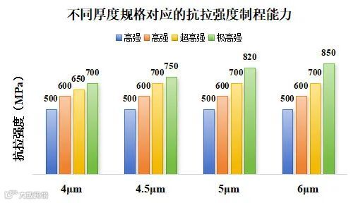 公司不仅成功攻克 800MPa极高强铜箔生产技术,更构建了行业领先的全规格产品矩阵,全面具备 4μm、4.5μm、5μm、6μm等多厚度规格超/极高强铜箔的规模化生产能力,覆盖从高强(500-600MPa)、超高强(600-700MPa)到极高强(700-850MPa)的全性能区间,充分满足不同场景下锂电池的差异化需求。