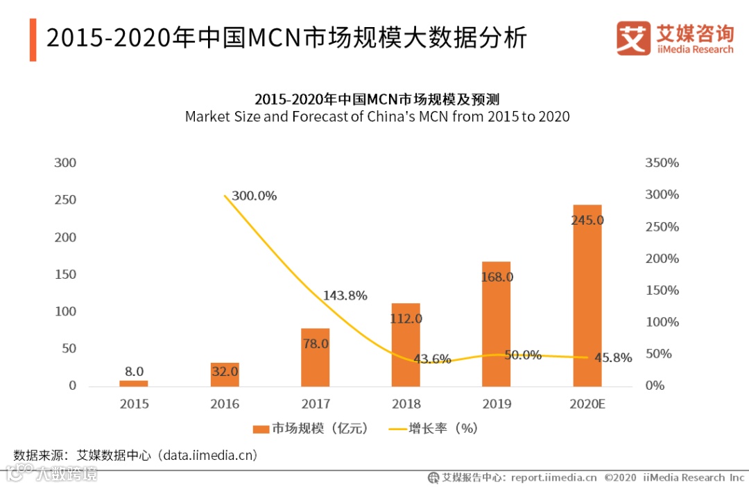 自2016年起中国MCN市场规模迅速扩张,2018年市场规模达到百亿级,在2019年的直播电商带货效益不断展现后,预计到2020年中国MCN市场规模将进一步扩展,达到245.0亿元。艾媒咨询分析师认为,目前电商直播的变现效益正在逐步展现,2020年MCN机构将享受到行业红利,但随着资本入驻以及MCN机构的不断增加,行业竞争将更加激烈。