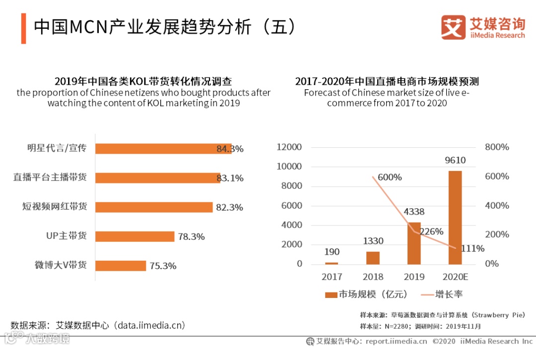 iiMedia Research(艾媒咨询)数据显示,明星或者网红KOL带货转化率都在75%以上,直播电商行业发展火爆,预计到2020年中国直播电商销售规模将达9160亿元,约占中国网络零售规模8.7%。