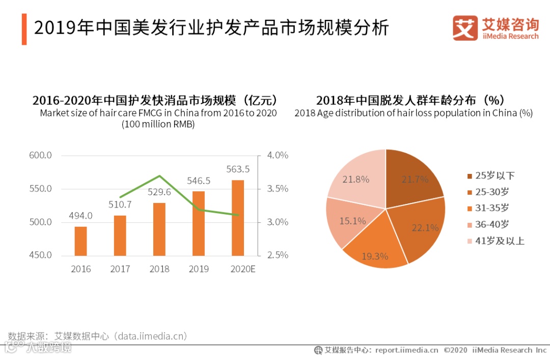 护发、防脱发产品是如今美发行业中的一大消费热点。中国护发快消品市场规模从2016年的494亿元增长到了2019年的546.5亿元,预计2020年达到563.5亿元。另外,iiMedia Research(艾媒咨询)数据显示,2018年,中国脱发的人群中,40岁以下占比达到了78.2%。艾媒咨询分析师认为,社会节奏快、工作压力造成脱发问题已成为了一种“时代病”,护发、防脱发产品成为这一人群的必需品。