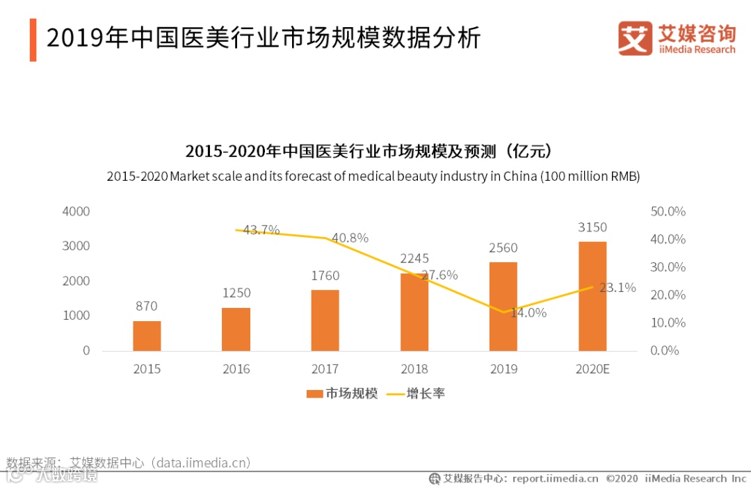 iiMedia Research(艾媒咨询)数据显示,从2015年开始,中国医美行业市场规模一直处于高速增长的态势,现在中国已经成为世界第三大医疗美容市场,预计2020年,中国医美行业规模将达到3150亿元。艾媒咨询分析师认为,虽然医美行业在中国起步相对较晚,但中国庞大的人口基数以及强大的消费能力推动医美行业在中国呈现出勃勃生机。