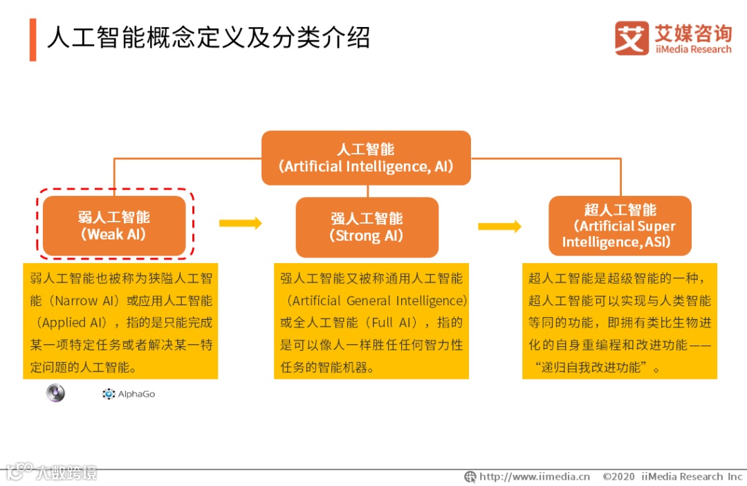 人工智能(Artificial Intelligence, AI)的定义仍相对模糊,目前普遍说法是拥有“仿人”的能力,即能通过计算机实现人脑的思维能力,包括感知、决策以及行动。人工智能按照智能程度大致可以分成三类:弱人工智能、强人工智能和超人工智能。现阶段所实现的人工智能大部分指的是弱人工智能,并且已经被广泛应用。弱人工智能即擅长于单个领域的、专注于完成某个特定任务的人工智能。最耳熟能详的例子便是战胜世界围棋大师的AlphaGo和iPhone手机语音助手Siri。