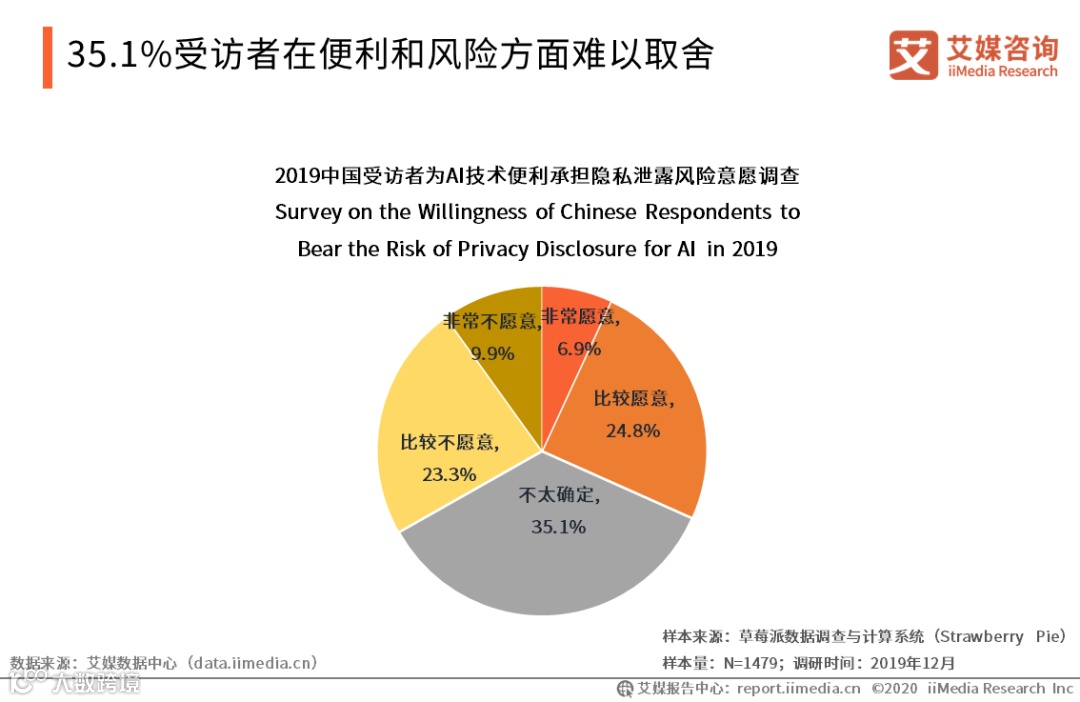 iiMedia Research(艾媒咨询)数据显示,在涉及效率和便捷与隐私泄露风险的问题上,受访者的回答呈现了与风险泄露的担忧相似的分布:33.2%的受访者不愿意以隐私交换便利,31.7%的倾向愿意,而选择不太确定的受访者占比35.1%。受访者在人工智能带来的隐私风险的回答上未呈现有偏向性的分布,然而仍有24.8%的受访者愿意承担隐私泄露风险,总体而言,受访者对人工智能的接受度和包容度高于预期。