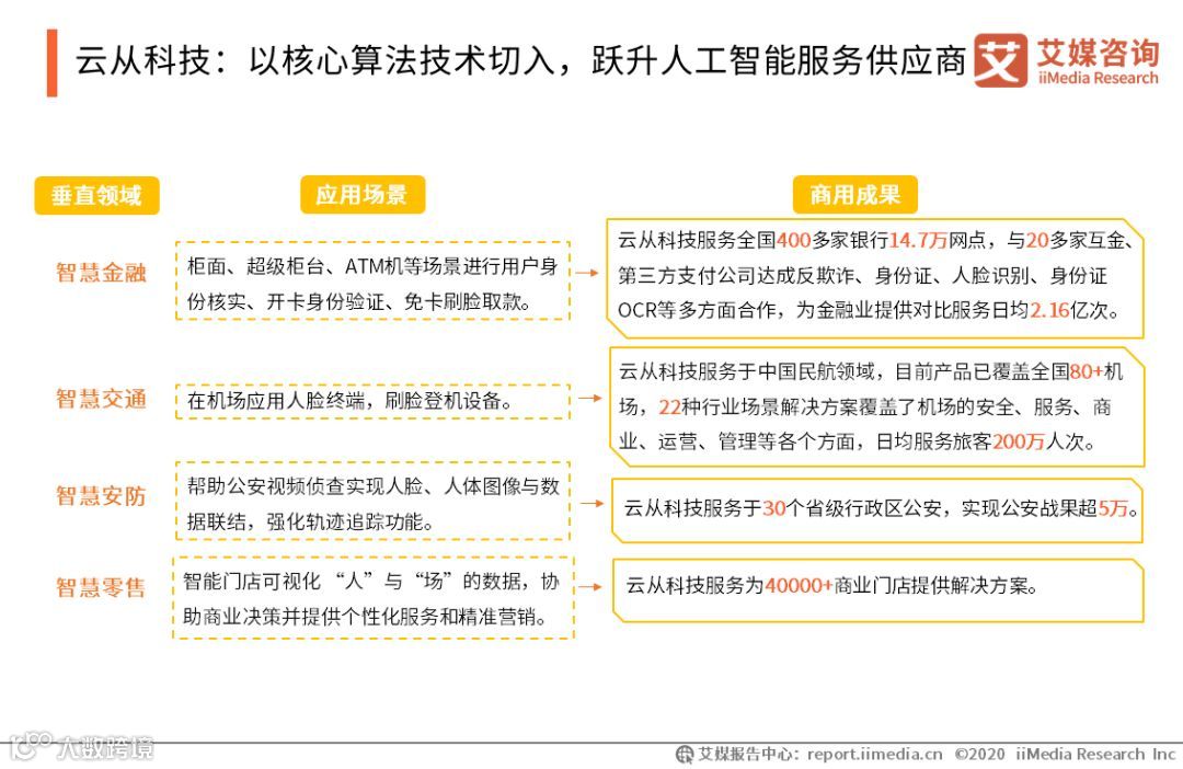 云从科技以自主研发的核心算法技术切入人工智能领域,经过4年的发展,逐渐形成了平台、应用、终端三位一体的产品体系,广泛应用于金融、交通、安防、零售等多个领域,公司也成功跃升为人工智能服务供应商。艾媒咨询分析师认为,云从科技拥有强大的技术研发实力,其具备的国家队背景为技术商业化应用拓展提供了极大助力。未来,在技术研发和商业应用并举的进程中,公司的竞争力将持续攀升。