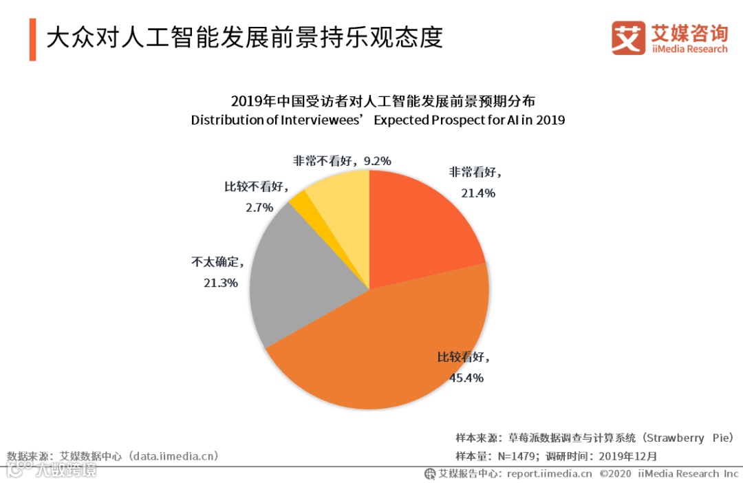iiMedia Research(艾媒咨询)数据显示,66.8%的受访者对人工智能发展前景持乐观态度,其中21.4%的受访者非常看好人工智能的发展前景。艾媒咨询分析师认为,得益于底层技术的进步与相关产业政策的利好,中国人工智能产业研发投入逐年加大,广泛的落地应用渗透到民众生活领域的方方面面。人工智能的普及给予民众切实直观的便利,一定程度上增强了民众对人工智能未来发展的信心。