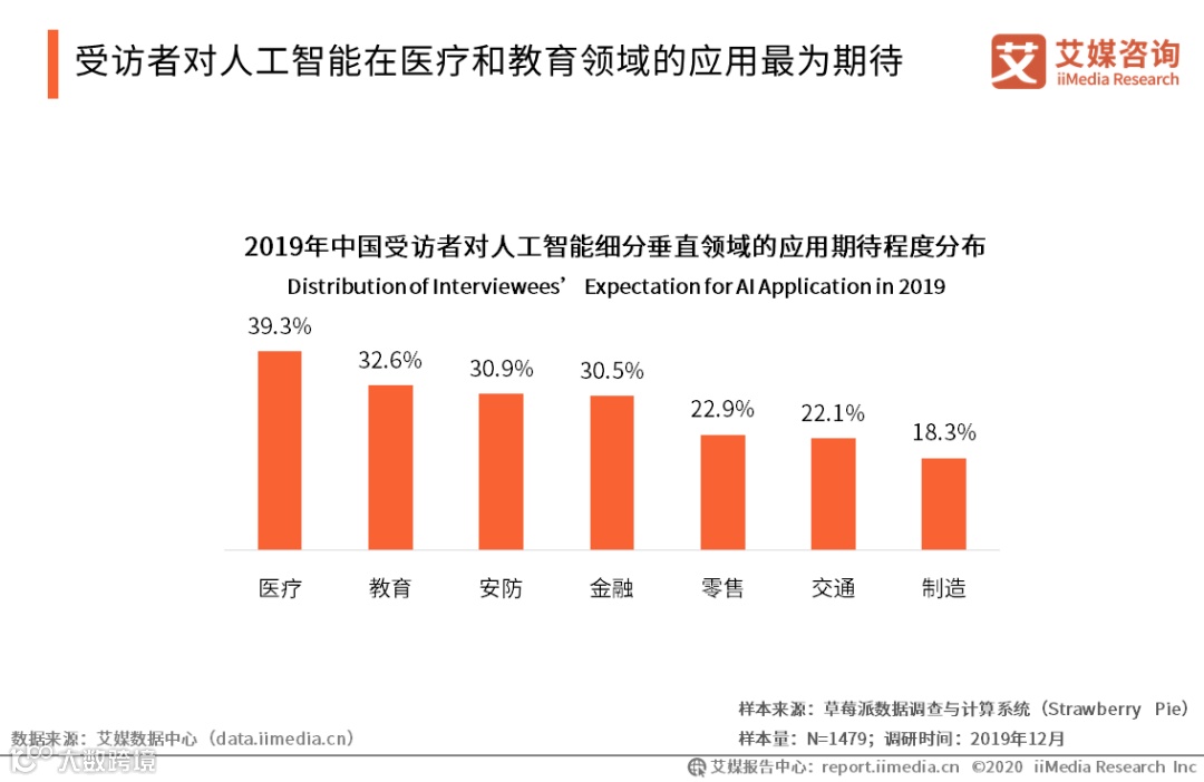 iiMedia Research(艾媒咨询)数据显示,医疗、教育、安防是大众最期待的三大人工智能应用领域,占比分别为39.3%、32.6%、30.9%。艾媒咨询分析师认为,AI+医疗的应用,如在线智能问诊、电子病历、疾病风险预测等能够在很大程度上缓解“看病难”的民生问题,与受访者生活息息相关,因而最受大众期待。此外,随着中产阶级的崛起,越来越多家庭对教育的重视程度以及投入力度均大幅上升,并期待借助人工智能技术解决中国长期以来面临的优质教育资源分配不均的问题。