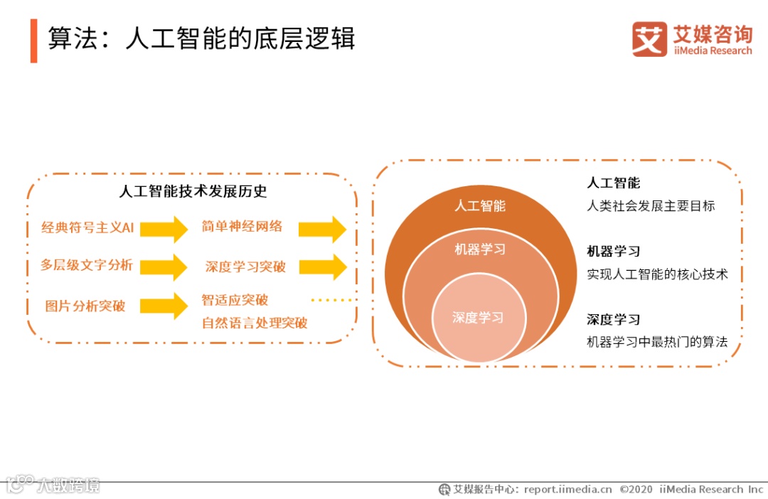 在当前弱人工智能的发展阶段,在算法未取得飞跃性突破时,大量的数据样本能促使机器学习,特别是其中的深度学习从数据中学习知识,提升其智能水平。数字化、信息化已使人类完成大量数据的沉淀,同时,5G技术的发展势必激起新一轮数据沉积。大数据能极高程度优化深度学习的复杂网络,而深度学习需要准确标记的图像或文本数据作为训练支撑。艾媒咨询分析师认为,引入更高精度和维度的数据是完善深度学习以助推AI产品落地的发展趋势。