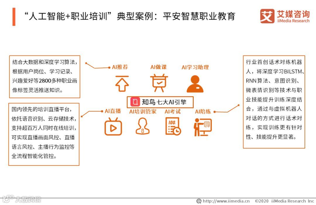 知鸟智能学习系统依托平安国际领先技术打造,通过深入研究各类培训场景推出AI做课、AI推荐、AI考试、AI直播、AI陪练、AI学习助理、AI培训管家七大AI引擎,以技术创新引领行业发展 。艾媒咨询分析师认为,企业人才是企业的核心竞争力之一,日趋激烈的市场竞争进一步提升了职业培训的刚需属性。平安智慧职业教育依托AI技术,可以有效填补中国职业培训市场空白,提升职业培训效率,助力组织人才培养。