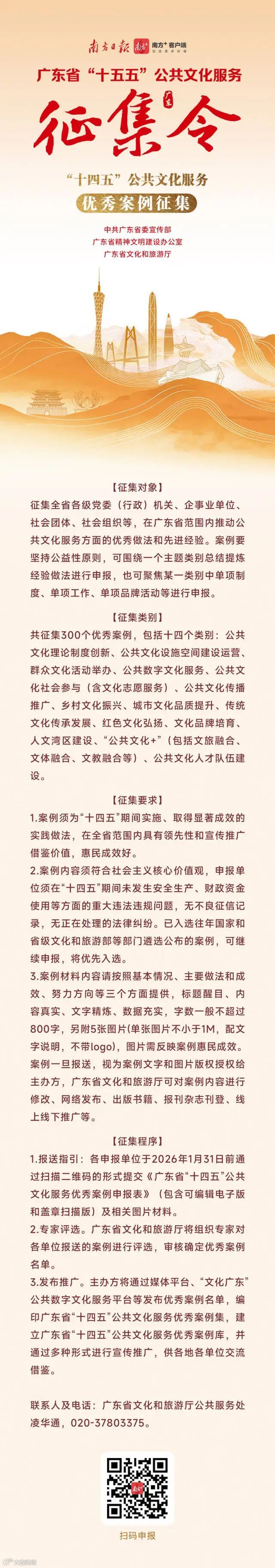 答:不复杂!2026年1月31日前,通过南方+、“文化广东”平台等渠道扫码就能提交材料。需要填写申报表,附上案例或主体介绍、图片等佐证材料。二维码就在征集令里,轻松扫码、一键参与!