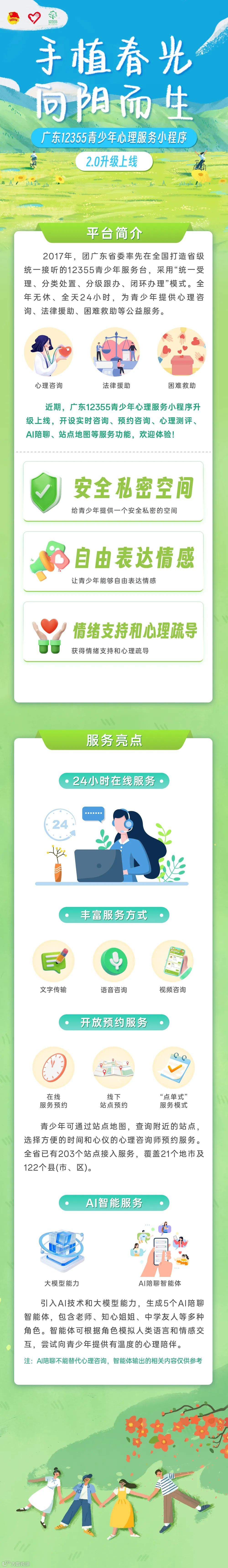 需求,团广东省委升级上线广东12355青少年心理服务小程序2.0,将其作为广东12355青少年服务台的重要载体之一,通过文字、语音、视频等方式,免费向青少年提供实时咨询、预约咨询、心理测评、AI陪聊、站点地图等公益服务,满足不同年龄段青少年差异化需求,帮助青少年纾解情绪、化解心结。