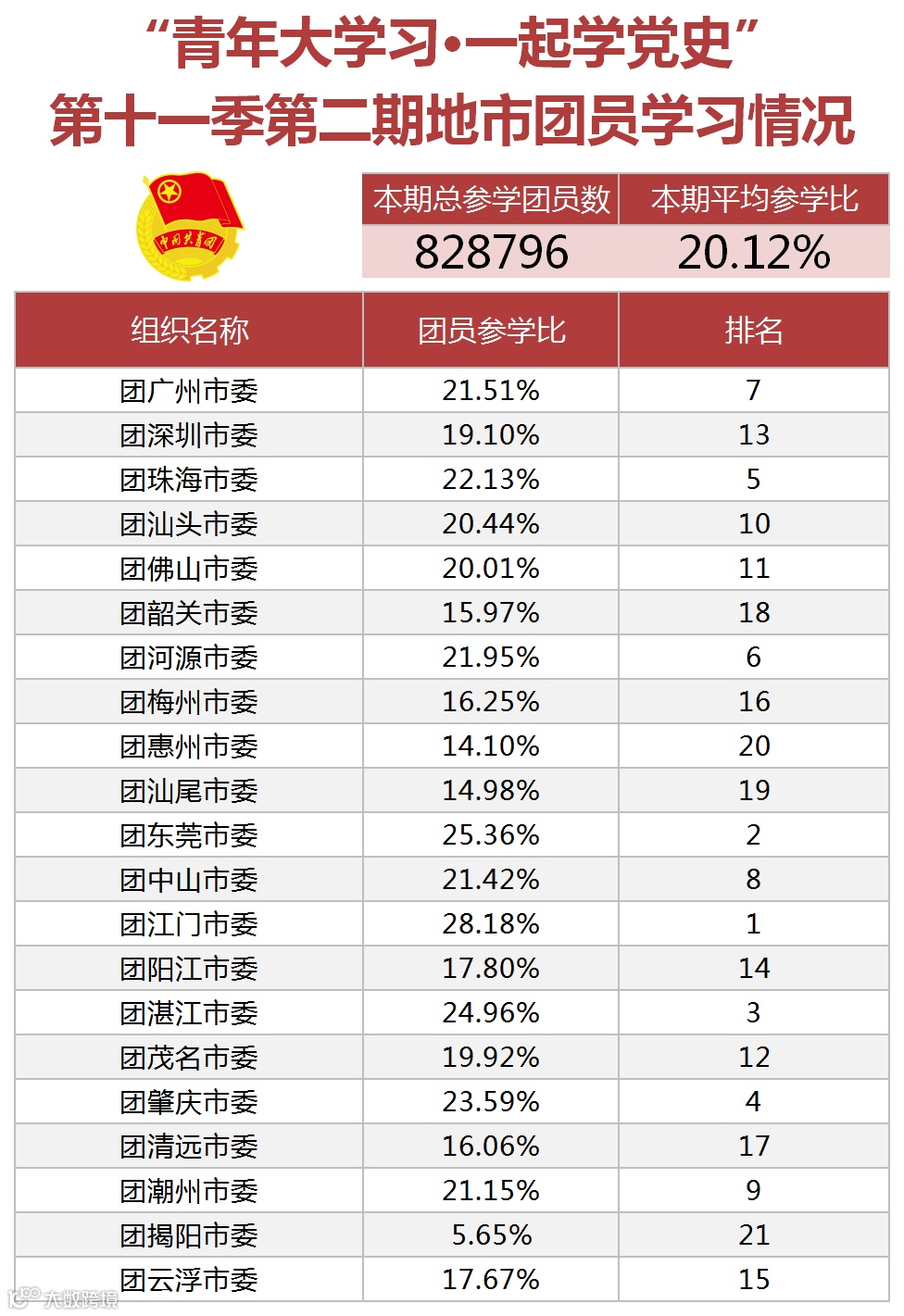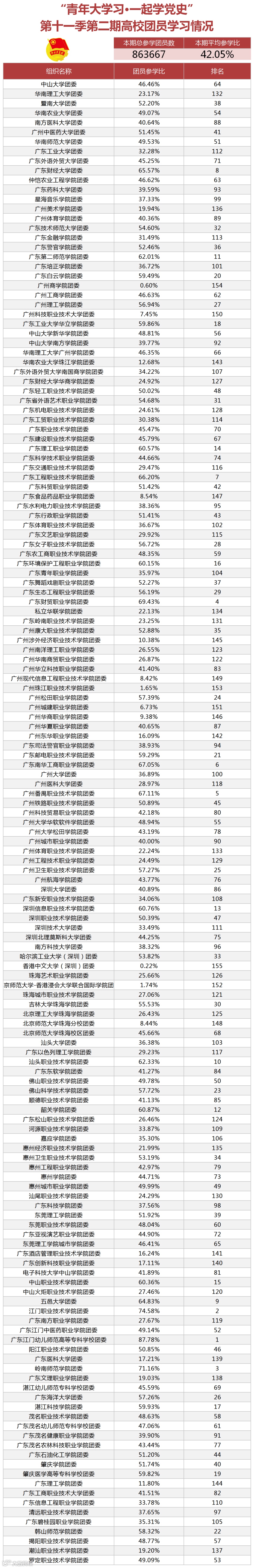 在各地市参学比上,江门、东莞、湛江参学率最高。参学比低于20%的地市,在接下来的学习中需进一步努力,采取有力措施,加强组织建设,有效提升引领力。