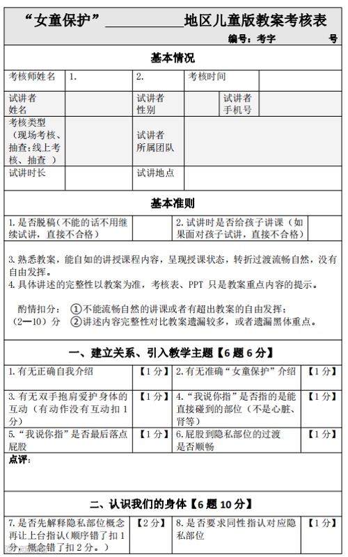 从2015年开始,我们就对讲师进行严格考核,今天在场的也有我们的讲师,应该是经过千锤百炼成为我们讲师的。大家看到这样一个考核表,我们把“女童保护”儿童防性侵的教案拆分成了61个要点,百分制,要脱稿试讲,90分以上合格。