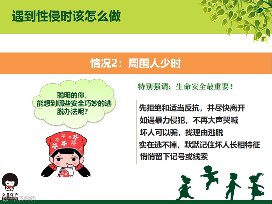 第三个部分我们会讲,如果真的遭遇性侵的时候该做什么。难道所有的情景都是大喊大叫吗?绝对不是的,我们会教他们在人多和人少的时候不同的应对方法。
