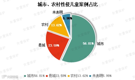 当然这个饼状图它至少意味着两个方面,并不是说发生在城市里的性侵儿童案一定比农村多,它恰恰也证明了由于媒体的公开度没有那么高,发生在农村的案子有很多是没有被公开曝光的。