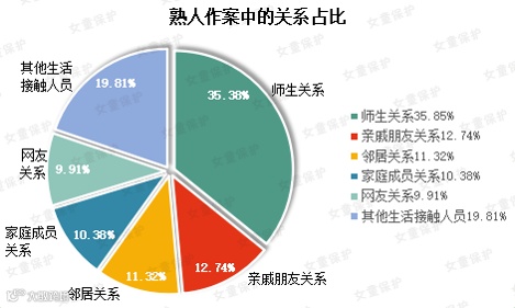 大家也可以看到这样的饼图,熟人作案的案例中,有师生关系的,有亲戚朋友,有网友,有家庭成员,以及其他的生活接触者。可能大家看到这个图的时候说老师性侵确实多,但我要说老师性侵案例确实不少,但这是因为它一般发生在学校的一些场合,因此曝光更容易。